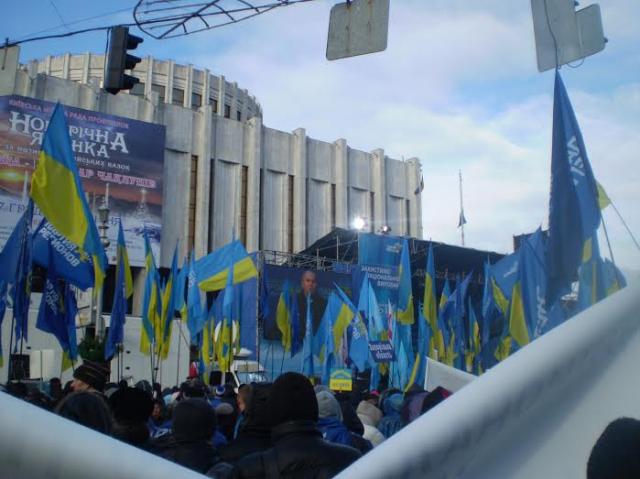 29 ноября, на второй день Вильнюсского саммита, когда очевидное стало явным и Янукович уехал из Литвы, не оставив лидерам ЕС своего автографа, Партия регионов организовала митинг на Европейской площади. Площадь уже несколько дней стояла пустой после того, как оппозиция убрала оттуда свою сцену и спустила флаги, объявив о присоединении к «евромайдану» на Майдане Независимости. Зато Партия регионов флагов не пожалела: на митинге их было чуть ли не столько же, сколько людей.
