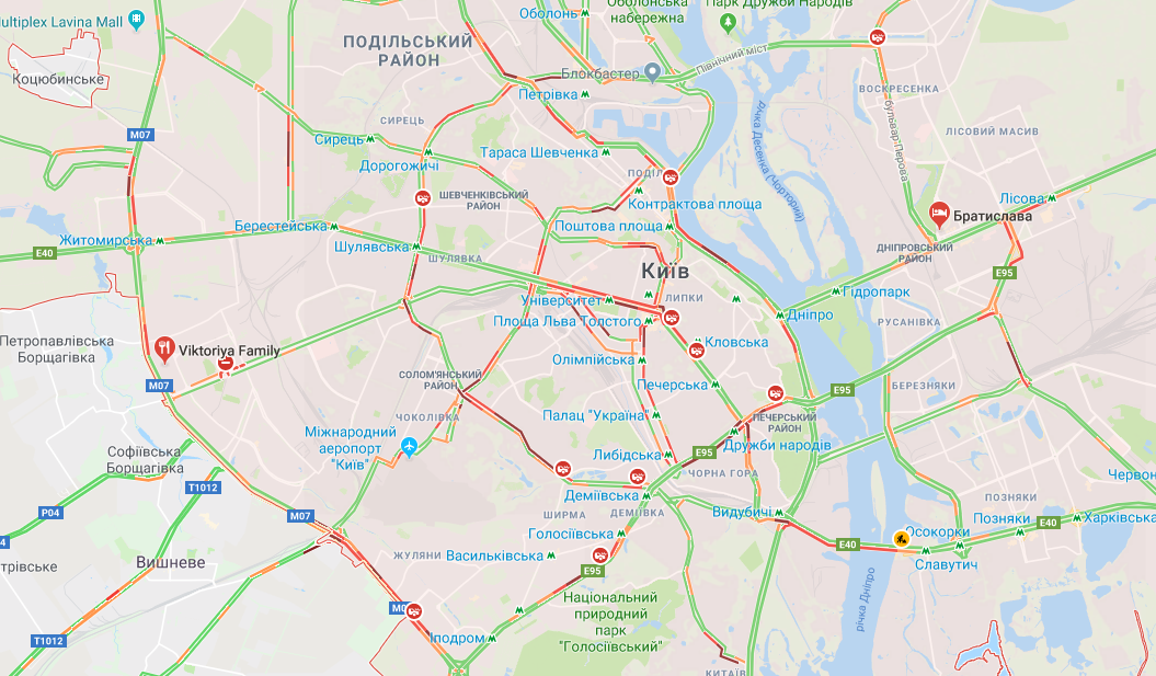Медленно движутся автомобили в сторону Петровки, площади Шевченко и Троещины.