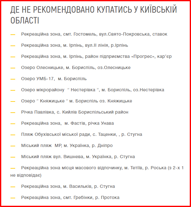https://racurs.ua/n108541-eksperty-minzdrava-obnarujili-kishechnuu-palochku-na-139-ukrainskih-plyajah-karta-infografika.htmlРакурсВ Украине 139 рек, пляжей, озер и водоемов попали в список не рекомендованных для купания. Такие данные 25 июля со ссылкой на Центр общественного здоровья обнародовала пресс-служба Министерства здравоохранения.