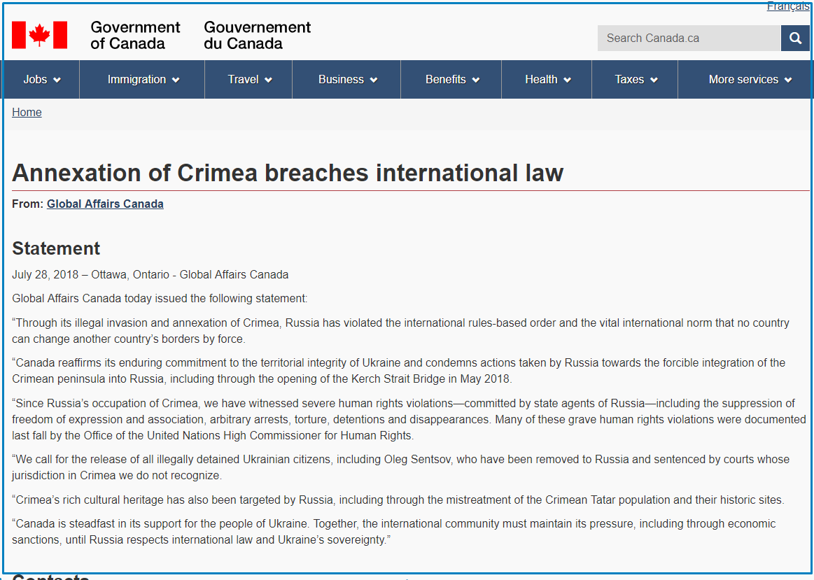 В правительстве Канады отметили, что, аннексировав Крым, Россия нарушила международное право, и ни одна страна не имеет права силой изменять границы других государств.