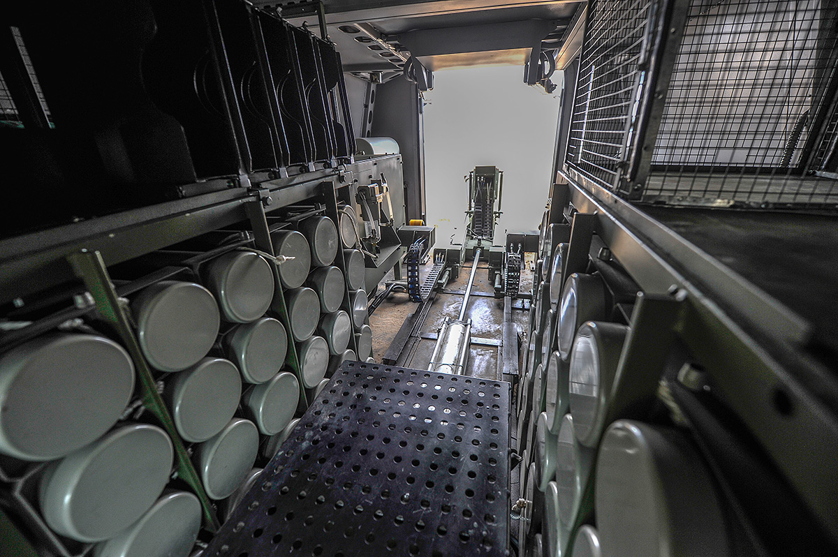 Машина перевозит боекомплект в количестве 60 мин, экипаж боевой машины состоит всего из трех человек.