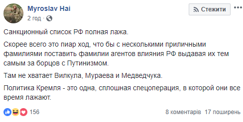 Журналист Мирослав Гай на своей странице в Facebook назвал новый список санкций России «пиар-ходом».