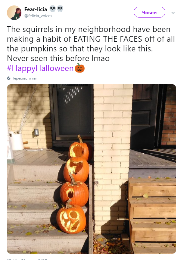 https://racurs.ua/n113488-spasayte-vashi-tykvy-v-ssha-prazdnovanie-hellouina-sprovocirovalo-apokalipsis-belok-foto.htmlРакурсХэллоуин неожиданно спровоцировал нашествие белок по всей территории США. Животных к человеческим жилищам привлекают праздничные тыквы, выставленные во дворах и на крылечках. В соцсетях «пострадавшие» от атаки белок публикуют фото того, как животные уничтожают главный атрибут праздника.