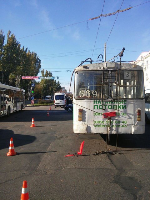 Авария произошла на перекрестке Соборного проспекта и улицы Днепровской. Упавшая троллейбусная штанга разбила окно маршрутки, осколки ранили пассажиров.