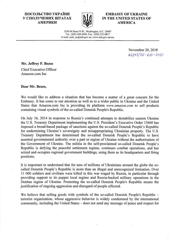 «Посольство Украины в США официально обратилось к основателю Amazon Джеффу Безосу с настоятельным призывом снять с веб-сайта amazon.com товары с символикой террористической организации ДНР, а также к руководству компании eBay Inc. о принятии аналогичных мер в отношении продукции с символикой так называемых ЛНР и ДНР», — говорится в сообщении.