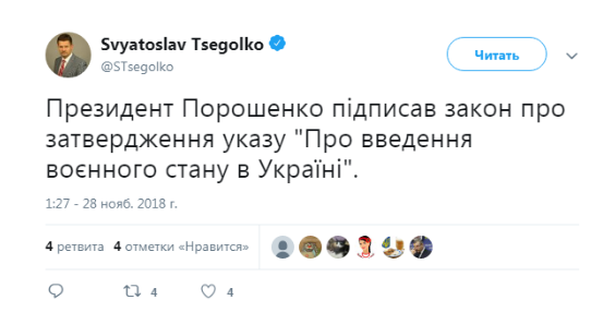 https://racurs.ua/n114815-poroshenko-podpisal-zakon-o-vvedenii-voennogo-polojeniya-v-ryade-oblastey-ukrainy.htmlРакурсЗаконопроект № 9338, которым предусматривается введение военного положения в Украине, подписан президентом Петром Порошенко. Об этом сообщает пресс-секретарь главы государства Святослав Цеголко в своем Twitter.