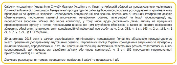 В пресс-службе Генпрокуратуры также подтвердили проведение расследования по факту заведомо ложного сообщения о преступлении, объединенного с искусственным созданием доказательств обвинения; нарушения тайны переписки, телефонных разговоров, телеграфной или другой корреспонденции, которые передаются средствами связи или через компьютер, в том числе в отношении государственного деятеля; воздействия на сотрудника правоохранительного органа с целью помешать исполнению им служебных обязанностей, а также по факту незаконного сбора, хранения и использования конфиденциальной информации о лице. В ГП добавили, что «одним из пострадавших является известный украинский журналист».