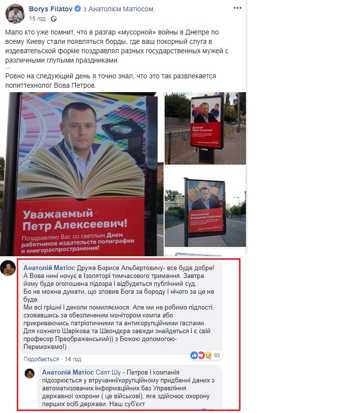 В то же время в соцсетях начали появляться сообщения, что речь идет о задержании политтехнолога и ведущего передачи «Люмпен-шоу» Владимира Петрова. В частности, эту информацию подтвердили мэр Днепра Борис Филатов и главный военный прокурор Анатолий Матиос. По словам Матиоса, Петров ночь на 30 ноября провел в следственном изоляторе. В целом о Петрове известно то, что в 2013 году он фигурировал в провокации с использованием БТР с изображением моркови на митинге оппозиции, а во времена президентства Януковича в 2010 году протестовал против журналистского движения «Стоп цензуре!».