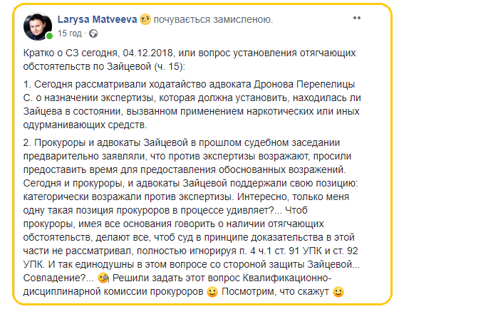 «Прокуроры и адвокаты Зайцевой на прошлом судебном заседании предварительно заявляли, что против экспертизы возражают, просили предоставить время для предоставления обоснованных возражений. Сегодня и прокуроры, и адвокаты Зайцевой поддержали свою позицию: категорически возражали против экспертизы», — написала в Facebook адвокат Матвеева.
