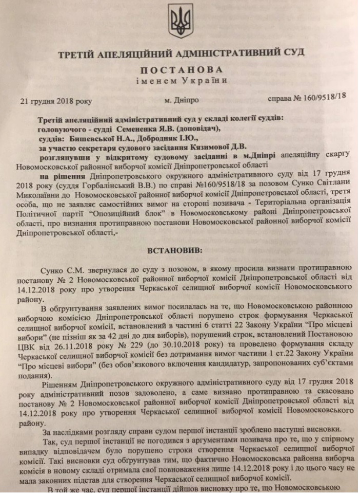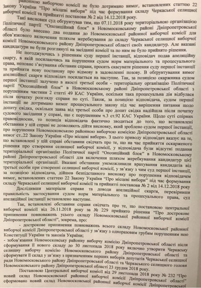 Кроме этого, по состоянию на 22 декабря сообщалось, что первые местные выборы в Черкасской ОТО Днепропетровской области, назначенные на 23 декабря, могут быть сорваны. Об этом «ОПОРА» сообщила со ссылкой на заявление председателя Черкасской территориальной избирательной комиссии. Там в суд поступило два ходатайства от «Оппозиционного блока» с похожими исковыми требованиями о признании противоправным решения об образовании Черкасской избирательной комиссии. Суд принял два противоположных решения. В первом случае удовлетворить, во втором — отказать полностью. 21 декабря Новомосковская комиссия выиграла апелляцию, поэтому Черкасская избирательная комиссия официально была признана правомочной.