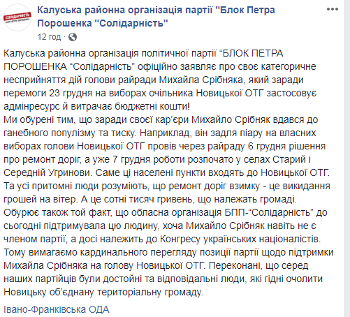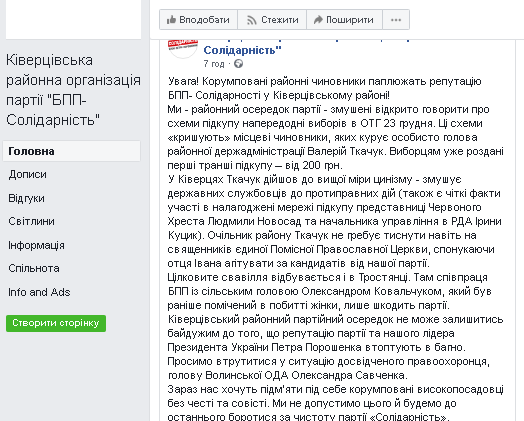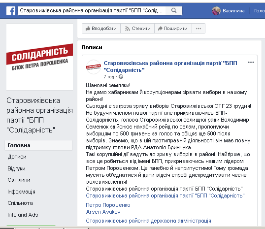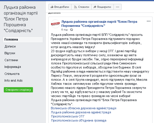 В то же время, как сообщает гражданская сеть «ОПОРА», на Волыни в соцсети Facebook появились страницы фейковых «районных ячеек» партии «Блок Петра Порошенко». Руководство политсилы заявило, что такие страницы являются фейковыми и были созданы неизвестными лицами с целью дискредитации БПП накануне выборов в ОТО. Подобная ситуация наблюдалась на Прикарпатье. В частности, 21 декабря в Facebook на фейковой странице «Калушской районной организации БПП» появилось сообщение о категорическом неприятия действий главы калушского райсовета, который якобы ради победы на выборах в ОТО применяет админресурс и тратит бюджетные средства.