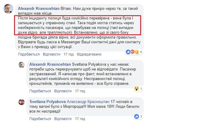 В комментарии в Facebook директор департамента организации внутренних и международных пассажирских перевозок «Укрзализныци» Александр Красноштан отметил, что полку после инцидента проверила комиссия, которая не обнаружила неисправностей.