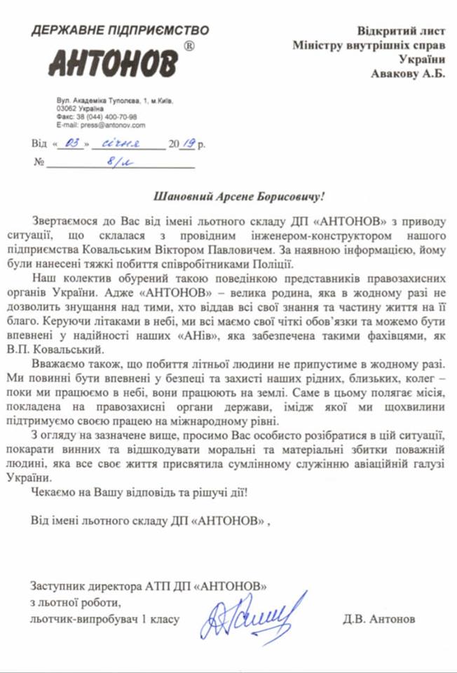 Также отметим, что сегодня сотрудники концерна «Антонов» обратились с открытым письмом к министру внутренних дел Арсену Авакову, требуя наказать виновных в избиении Ковальского