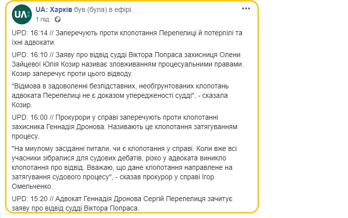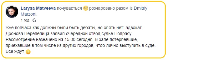 «Уже полчаса как должны были начаться дебаты, но опять нет: адвокат Дронова Перепелица заявил очередной отвод судье Попрасу… В зале потерпевшие, которые приехали в том числе и из других городов, чтобы лично выступить в суде», — написала в Facebook адвокат пострадавших Лариса Матвеева.