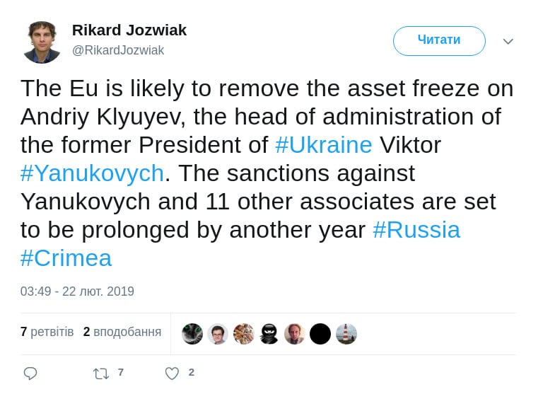 Напомним, в марте 2018 года Евросоюз не стал продолжать санкции против Клюева и министра юстиции времен президентства Януковича Елены Лукаш.