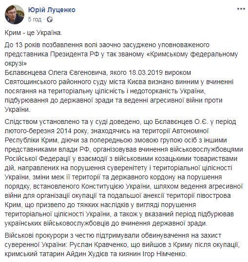 Белавенцева признали виновным в посягательстве на территориальную целостность и неприкосновенность Украины, сообщил в Фейсбук генеральный прокурор Юрий Луценко.