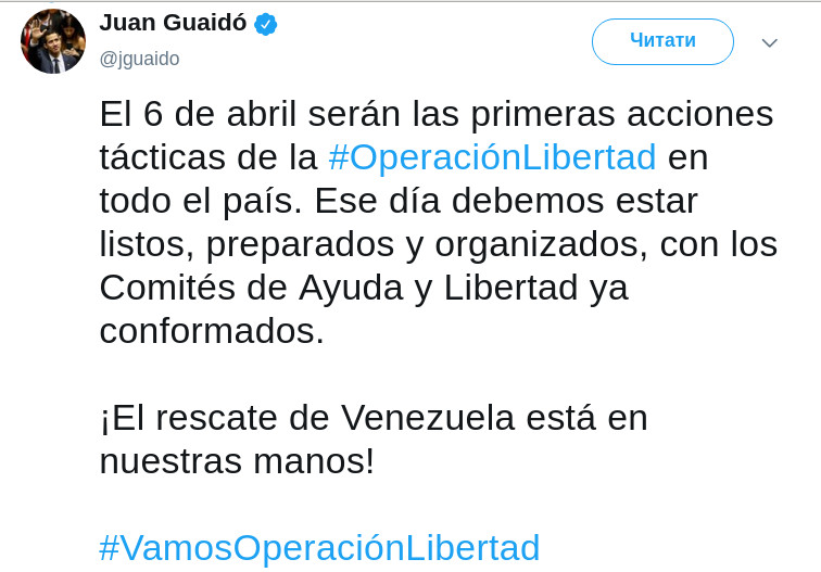 По его словам, 6 апреля начнутся «первые тактические действия» операции «Свобода», которая приведет к прекращению правления Мадуро. Об этом оппозиционер заявил в своем Твиттере.