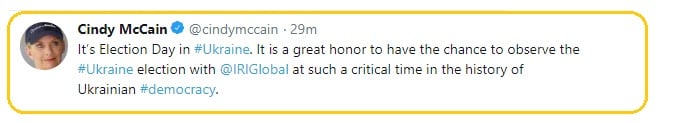 Вдова американского сенатора Синди Маккейн будет работать наблюдателем на выборах президента Украины в составе миссии, организованной Международным республиканским институтом США (IRI) и Институтом имени Маккейна университета штата Аризона. Ранее Синди отметила, что для нее честь быть в составе миссии наблюдателей IRI.