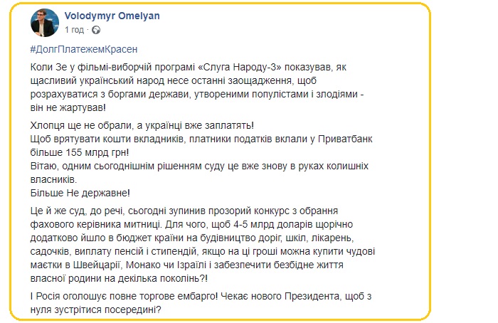 «Государство должно отдать Коломойскому к предварительным 5,5 млрд долл. и еще 2 млрд долл. из государственного бюджета. То есть каждый украинец уже заплатил 75 тыс. грн Коломойскому, а теперь дополнительно еще заплатит 30 тыс. грн. Первые последствия избрания нового презедента? Берегите доллары, гривне приготовиться к прыжку вверх», — пишет представитель «Реанимационного пакета реформ» Виктор Таран.
