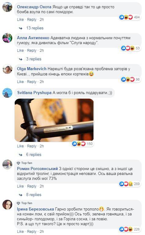 Пользователи соцсетей сразу увидели в этом аллюзию на популярную роль Зеленского в сериале «Слуга народа», каждая серия которого начинается с заставки, на которой президент Василий Голобородько едет на велосипеде на работу на Банковую.