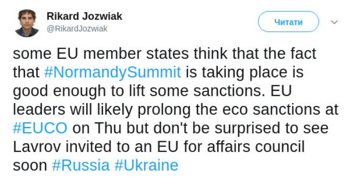 Но не удивляйтесь, что Лавров (министр иностранных дел России Сергей Лавров — ред.) скоро будет приглашен в Совет по делам ЕС Россия-Украина, — отметил Йозвяк.