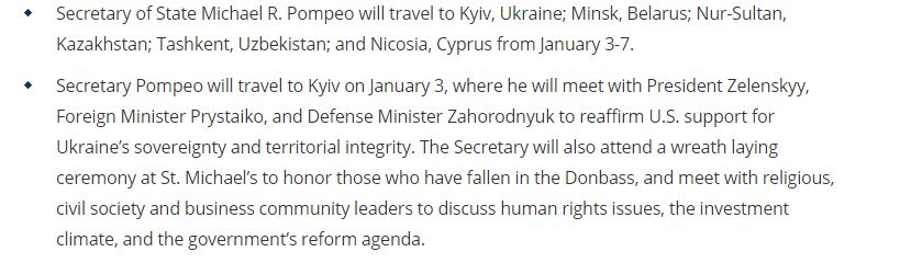В Украину Помпео должен был приехать 3 января, чтобы встретится с Владимиром Зеленским, своим коллегой Вадимом Пристайко и министром обороны Андреем Загороднюком. Он планирует почтить память погибших на Донбассе в Михайловском соборе столицы и встретиться с элитой Украины, чтобы подискутировать относительно соблюдения прав человека, инвестиционном климате и реформах.
