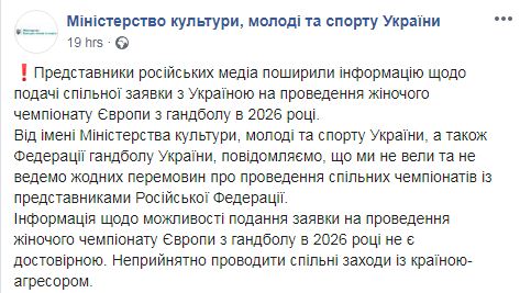 Мы не намерены проводить совместно с Россией женский Чемпионат Европы по гандболу 2026 года. Никаких переговоров о проведении совместных чемпионатов с представителями Российской Федерации не велось и не ведется. Информация о возможности подачи заявки является недостоверной. Неприемлемо проводить совместные мероприятия со страной-агрессором, — так ответили россиянам в Минкульте.