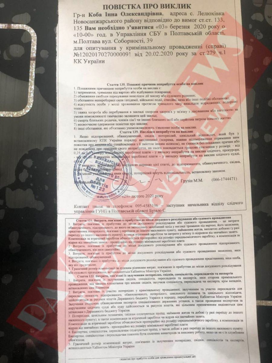 Постановление о вызове на допрос было подписано 29 февраля 2020 года. Коба должна явиться на допрос 3 марта в 10.00 в управление СБУ в г. Полтава. Об этом пишет Telegram-канал PavlovskyNews.