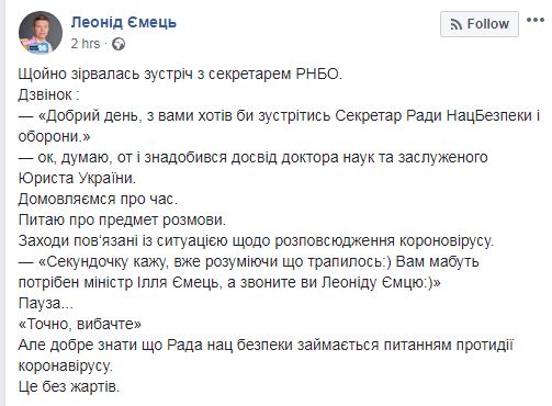 О курьезе рассказал в Фейсбук Леонид Емец, нардеп предыдущих созывов Рады. Он пошутил, что «только что у него сорвалась встреча с секретарем СНБО». Емцу позвонили и сообщили, что с ним намерен встретиться секретарь Совета нацбезопасности и обороны. Экс-нардеп подумал, что, вероятно в СНБО «пригодился опыт доктора наук и заслуженного юриста Украины». Но во время разговора стало понятно, что в СНБО «ошиблись емцами».