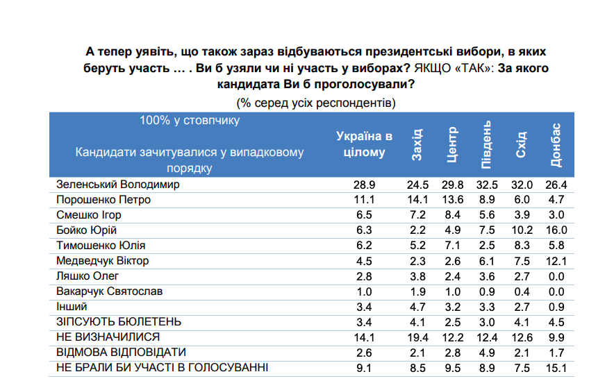 В пятерку лидеров также вошли нардеп от «Оппозиционного блока» Юрий Бойко и лидер «Батькивщины» Юлия Тимошенко. Их поддерживают более 6% респондентов (около 8% среди тех, кто определился).