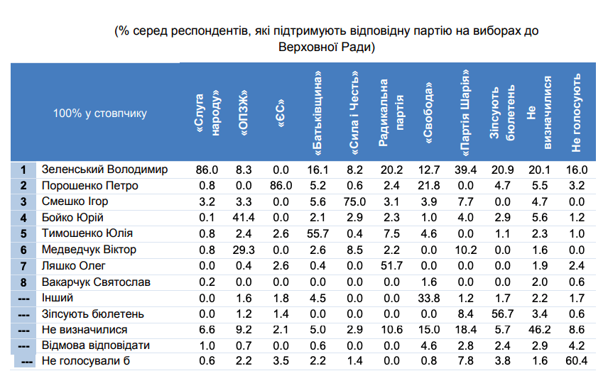 Также среди опрошенных украинцев на выборах в Верховную Раду за «Слугу народа» готовы голосовать 86% избирателей Зеленского. Также 86% поддержки получила бы партия «Европейская солидарность» среди избирателей Порошенко. При этом за партию «Батькивщина» готовы отдать свои голоса только 55% украинцев, которые голосовали бы за Тимошенко.