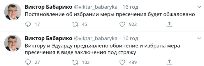 Также арестован сын Бабарико Эдуард. Для обоих суд избрал меру пресечения в виде содержания под стражей. Об этом в Твиттере сообщила пресс-служба кандидата в президенты Беларуси.