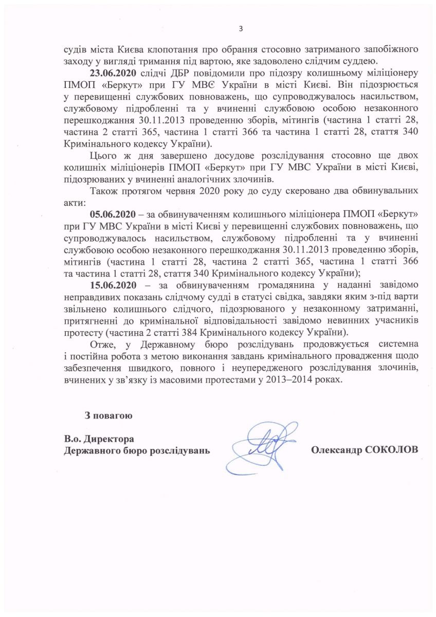 Кроме того, сообщено о подозрении бывшему прокурору столичной прокуратуры, который 21 января 2014 года согласовал подозрение в массовых беспорядках двум незаконно задержанным участникам Евромайдана, а также следователю киевской милиции, в тот же день незаконно задержавшему одного из активистов и вручившему ему уведомление о подозрении в организации массовых беспорядков.