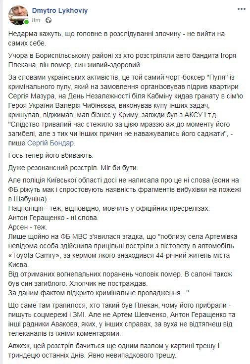 И вот вчера я узнал, что организатора Игоря Плекана расстреляли неизвестные лица. И часть из этих «неизвестных» я по фамилиям знаю. Это конкретные полицейские, которые, несмотря на все доводы и обещания, не задержали его еще полтора года назад и не сохранили тем самым убийце жизнь, — говорится в сообщении.