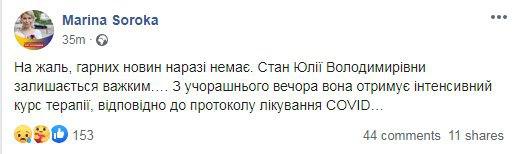 Пресс-секретарь Тимошенко Марина Сорока в Фейсбук написала, что она получает интенсивный курс терапии, согласно протоколу лечения COVID-19.
