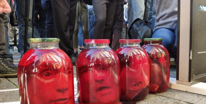 Его участники, в частности, устроили перформанс под зданием Офиса президента на улице Банковой — они принесли с собой бутылки с красной смесью, в которых разместили фотографии президента РФ Владимира Путина, одного из лидеров ОПЗЖ Виктора Медведчука и пророссийского блогера Анатолия Шария. Об этом сообщает Telegram канал PavlovskyNews.