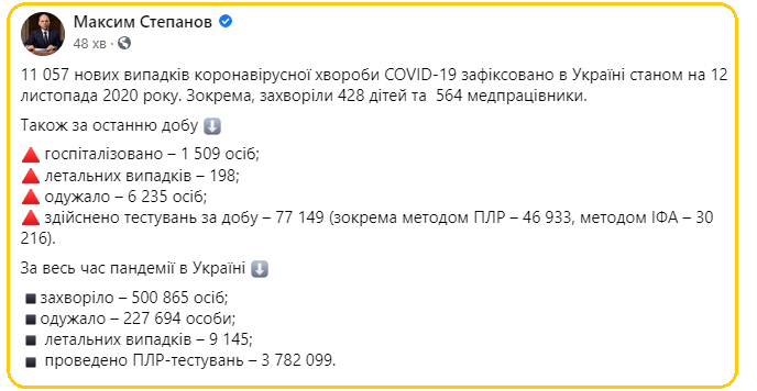 Заболели 428 детей и 564 медработника. Выздоровели — 6 тыс. 235 человек, — сообщил в Фейсбуке министр здравоохранения Максим Степанов.