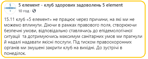 В ходе комплексных проверок правоохранители прибыли в спорткомплекс, который, несмотря на ограничения Кабмина, продолжил работу. На просьбу полицейских прекратить работу, администрация отреагировала отказом. В итоге был составлен административный протокол и начато уголовное производство, — сообщила Полиция Киева в Фейсбук.