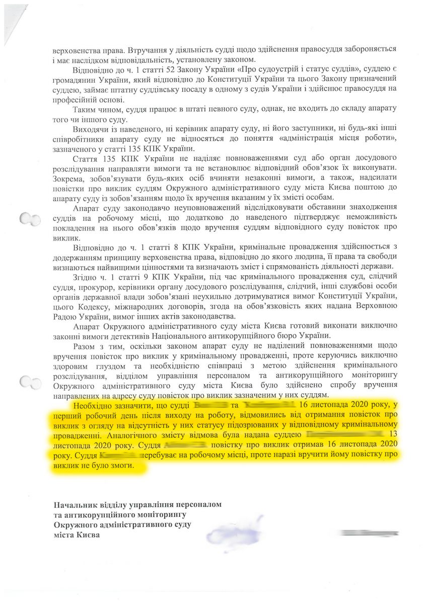 Факт отказа от получения повестки и ознакомления председателя ОАСК с ее содержанием, задокументирован на видео, — отметили в бюро.