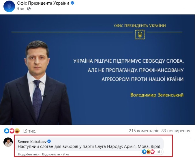 Следующий слоган Зеленского на выборах: «Армія, Мова, Віра», — шутят сегодня пользователи соцсетей на странице Офиса президента Украины в Фейсбук.