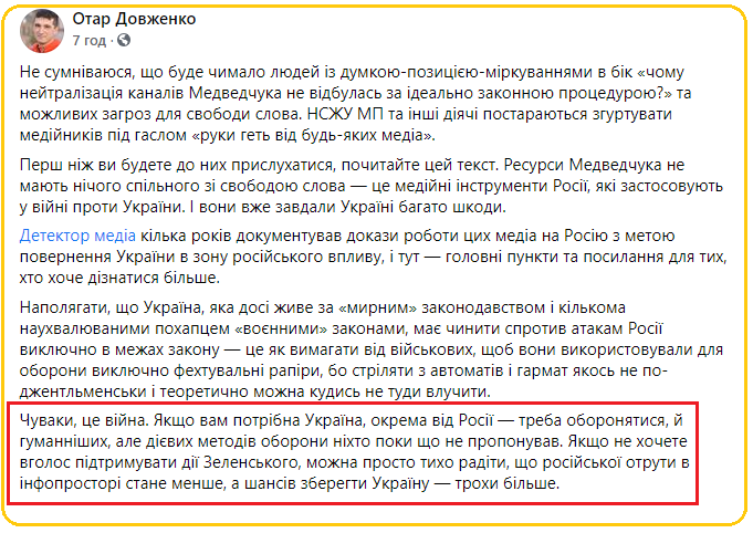 Также на Банковой отметили, что годами указанные телеканалы продвигают дезинформацию Кремля в Украине (риторику вроде «фашизма», «русофобии», «внешнего управления», образа Украины как недогосударства и переложения ответственности из Москвы за войну и аннексию), и напомнили, что Украина находится в состоянии гибридной войны с Россией, в том числе и информационной.