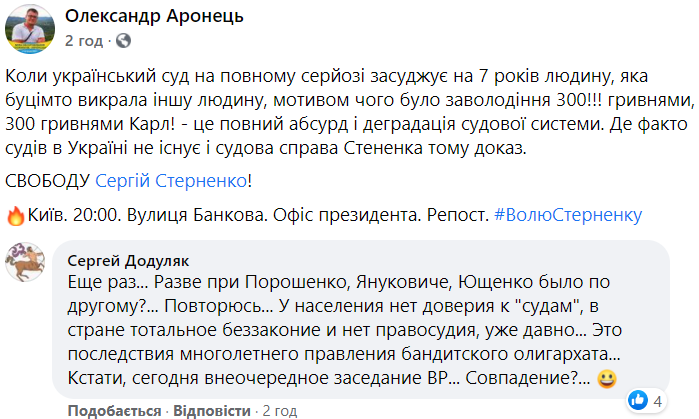 Вместе с тем не все критикуют сегодняшнее решение суда о Стерненко. В частности, представители окружения Януковича одобрительно отреагировали на приговор Стерненко.