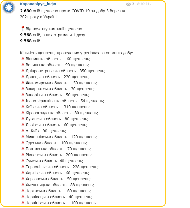 Напомним, 24 февраля в Украине началась вакцинация против коронавируса препаратом CoviShield — вакциной от Oxford/AstraZeneca, которую производят в Индии. Сначала вакцинируют медиков. За сутки наибольшее число привитых зафиксировано в Днепропетровской области (350 прививок).
