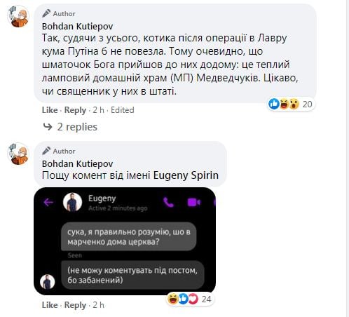 Сообщение и видео вызвали оживленную реакцию у пользователей. Журналист Богдан Кутепов иронизирует: «Котика после операции в Лавру кума Путина не повезла бы. Очевидно, что кусочек Бога пришел к ним домой: это теплый ламповый домашний храм (МП) Медведчуков. Интересно, есть ли у них священник в штате?».