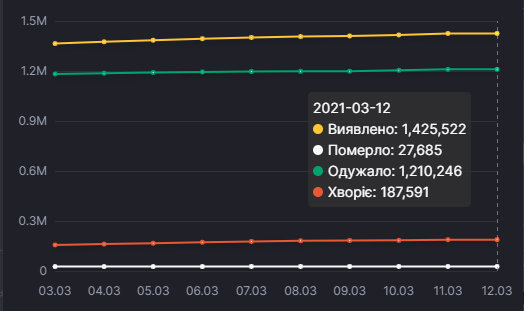 За год пандемии в Украине обнаружили 1 млн 438 тыс. случаев коронавирусной инфекции. К сожалению, болезнь унесла жизни 27 тыс. 915 пациентов.