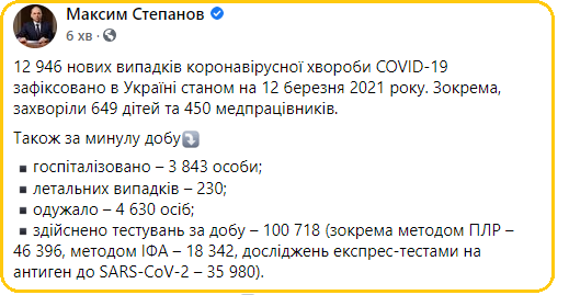 Об этом сообщил министр здравоохранения Максим Степанов 12 марта на собственной Фейсбук-странице.