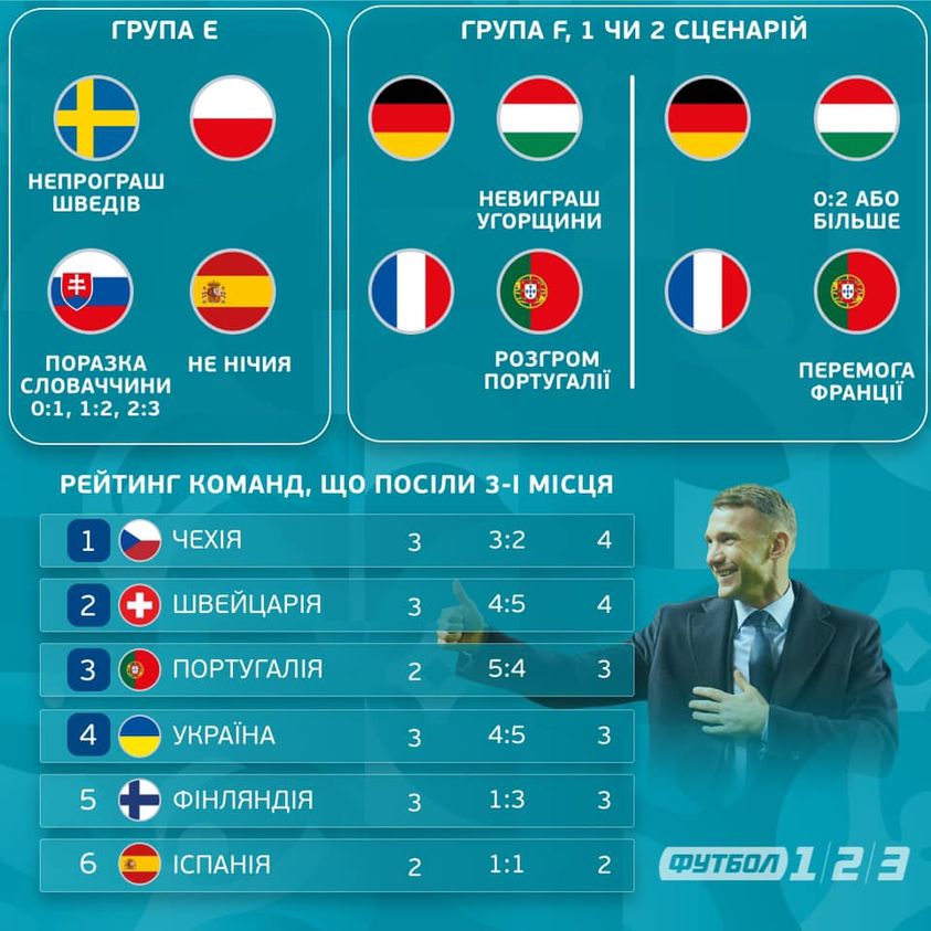 Если сработает хотя бы один из этих вариантов, то сборная Украины выходит в плей-офф, потому опередит в рейтинге третьих команд в группах сразу две сборные — Финляндию и кого-то из группы E или группы F.