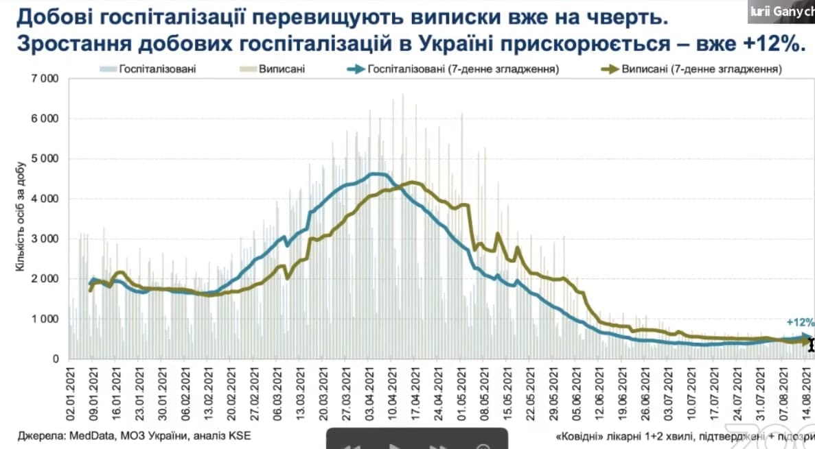 В 16 регионах недельный рост уровня госпитализаций составляет от 18 до 80 человек. В то же время Украина продолжает наращивать темпы вакцинации: ее текущие показатели превосходят среднемировые и европейские.