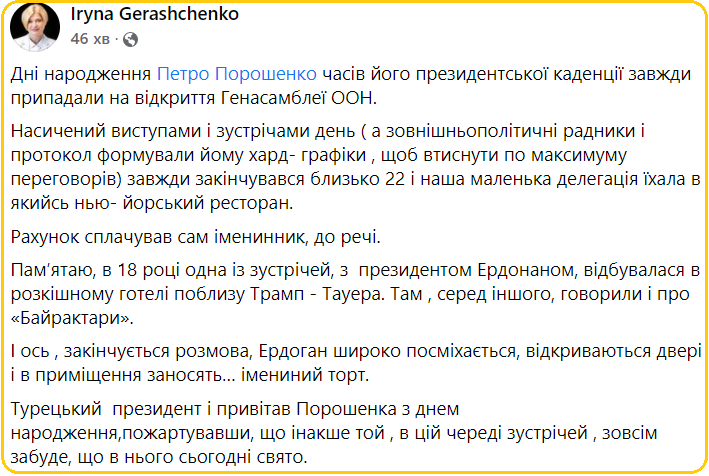 https://racurs.ua/n163529-poroshenko-vspomnili-prazdnovanie-dnya-rojdeniya-s-erdoganom-foto.htmlРакурсКак Петр Порошенко во время своего президентства праздновал дни рождения, рассказала нардеп от «Евросолидарности» Ирина Геращенко. По ее словам, именины Порошенко всегда приходились на открытие Генеральной ассамблеи ООН.
