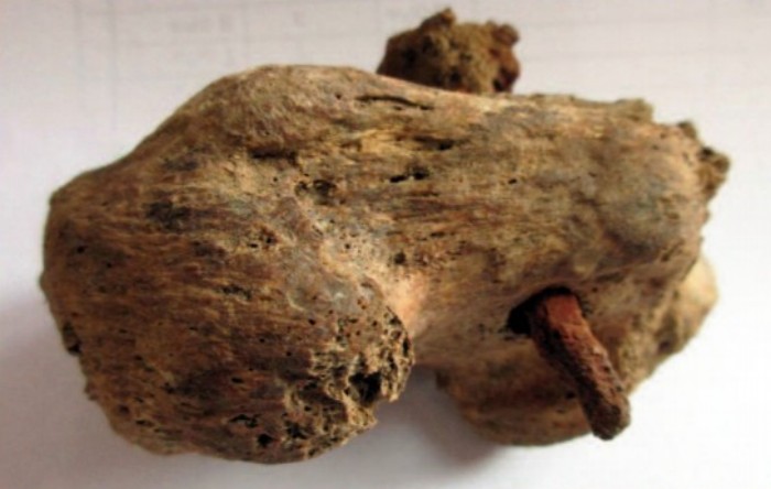 При исследовании костей скелета в лаборатории ученые обнаружили 13-й гвоздь, который был горизонтально вбит в правую пяточную кость.